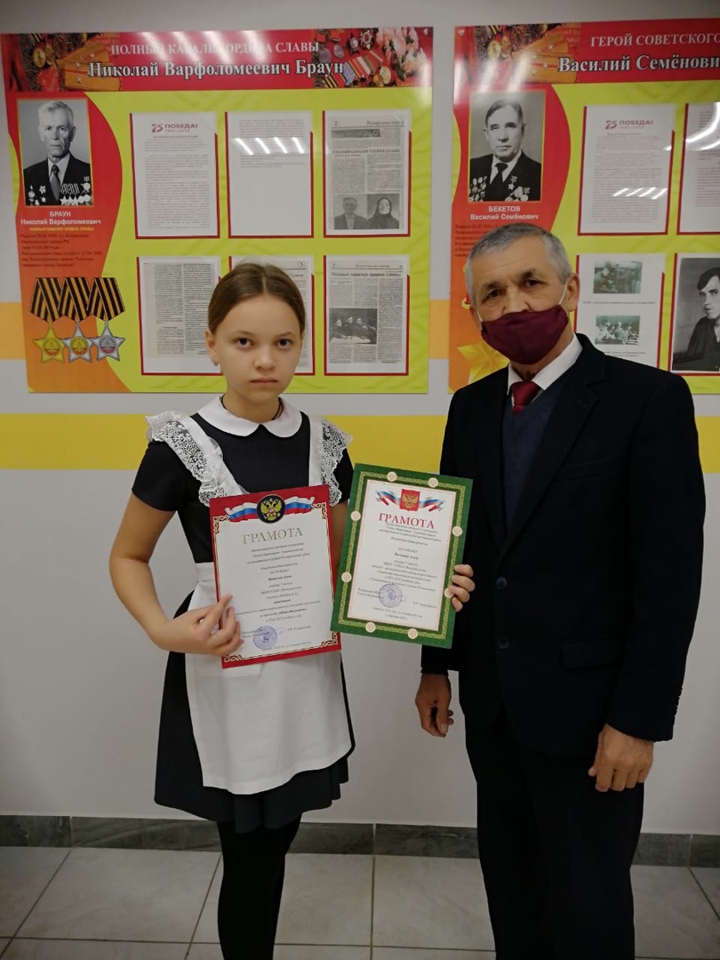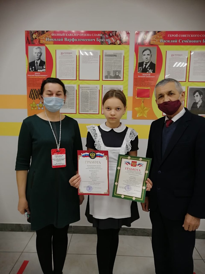 Васильева Алёна, обучающаяся 7 класса, победитель по обществознанию (учитель Ишбаев Ахмет Ахмадуллович), призёр по технологии (учитель Арсланова Гульназ Рамильевна)
