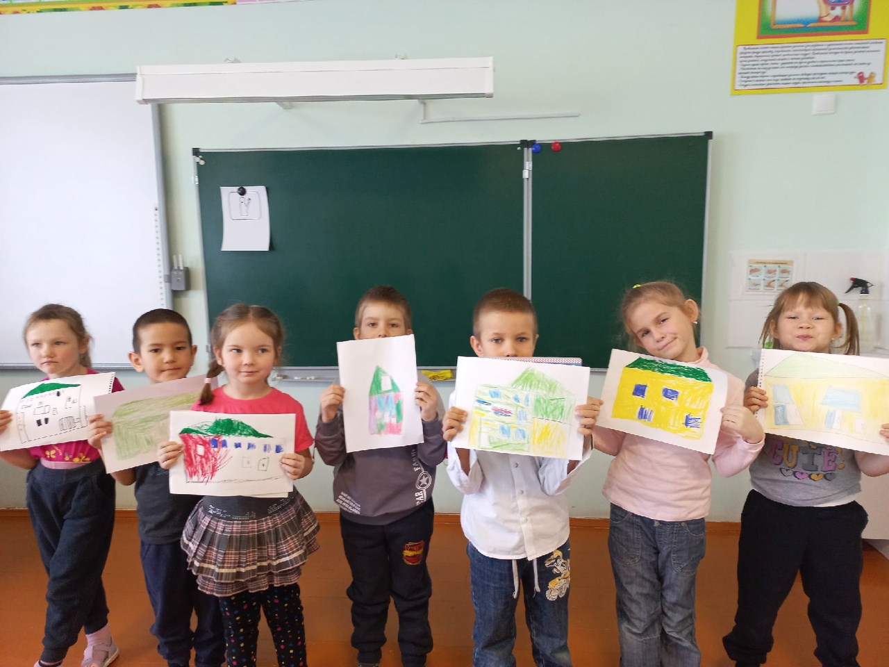 Первое занятие было посвящёно правилам поведения на уроке. Ребята учились сидеть за партой и отвечать на вопросы учителя.Занятие провела учитель начальных классов Рыскулова Г.Ю. После урока прошла экскурсия по школе , ребята побывали в библиотеке и выбрали свои первые книги, поиграли в шашки , примерили национальные костюмы, с интересом рассматривали картинки и нарисовали школу.
