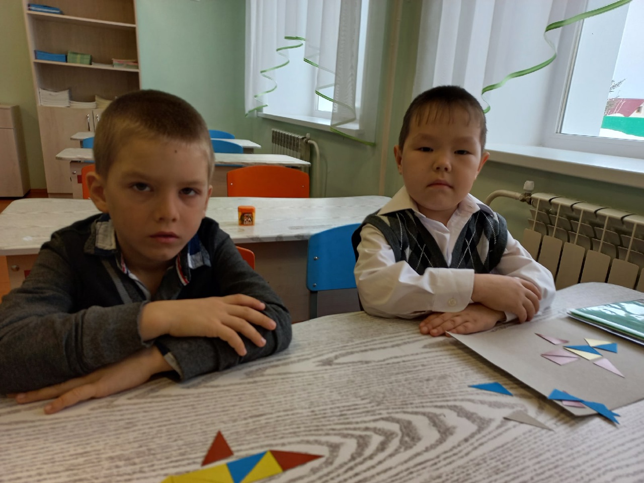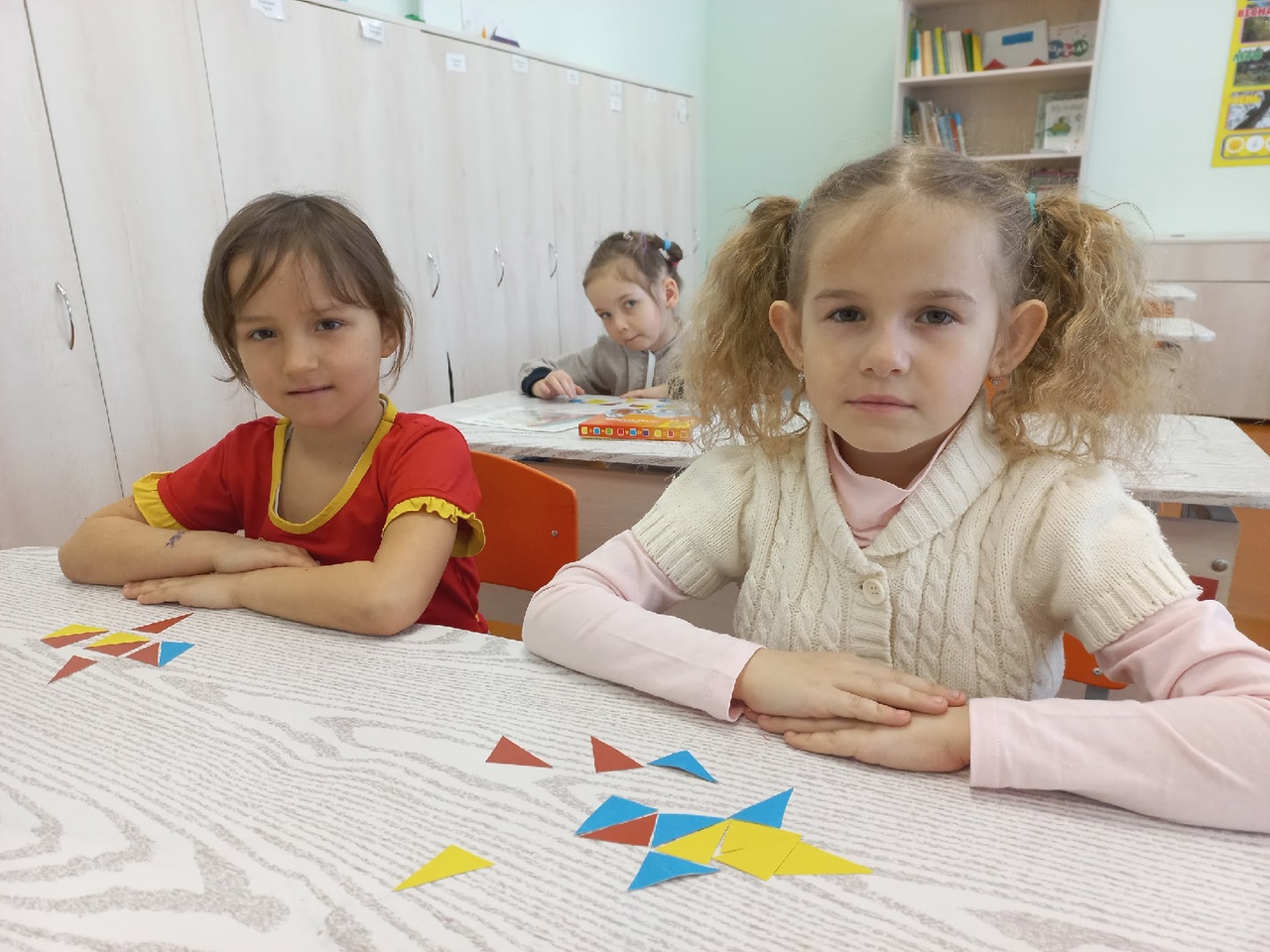 На первом занятии ребята учились считать до 10 и узнали новую фигуру "треугольник " .Потом с помощью фигур попробовали сделать самолёты
