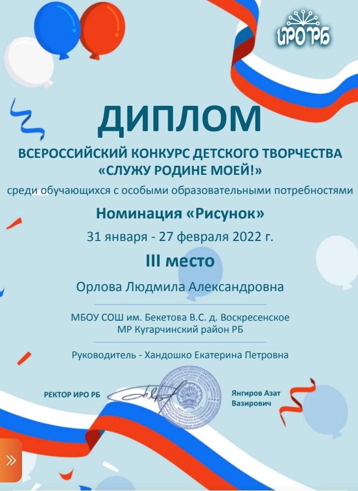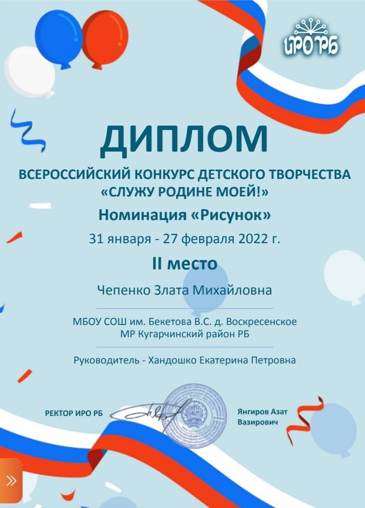 Обучающиеся 8 класса МБОУ СОШ им.Бекетова В.С. д.Воскресенское стали призерами Всероссийского творческого конкурса рисунков, объявленном ИРО РБ, "Служу Родине моей".