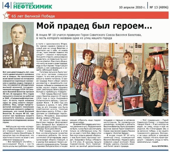 В преддверии празднования 77-летия Победы в Великой Отечественной войне и в связи с присвоением нашей школе высокого звания Героя Советского Союза Бекетова В.С. 19 апреля была организована муниципальная онлайн-викторина для обучающихся 5-11 классов «Потомки Бекетова».