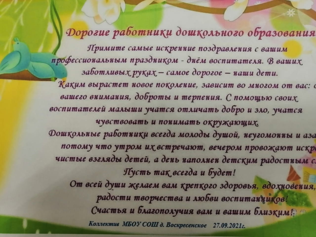 27 сентября обучающиеся МБОУ СОШ д.Воскресенское вместе с вожатой Хайруллиной А.Г. поздравили с профессиональным праздником наших уважаемых воспитателей, нянечек и всех тех, кто работает с нашими детками в красивейшем, современном