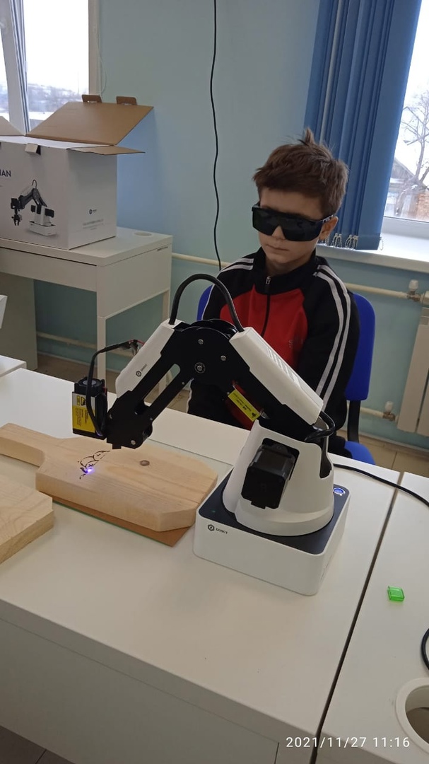 На последнем занятии использовали лазер для выжигания на разделочной доске. С его помощью ребята готовят изделие творческого проекта по технологии для участия в муниципальном этапе Всероссийской олимпиады школьников. Другая группа участников кружка работают с набором "Стэм-лаборатория". Они своими руками собирают угловой манипулятор. "Отрадно, что на занятия, которые походят по субботам, приходят не только мальчики, но и девочки. Дети с удовольствием осваивают программируемые роботы. Им очень нравится. Так что присоединяйтесь и Вы!" - говорит руководитель кружка Ишбаев А.А.
