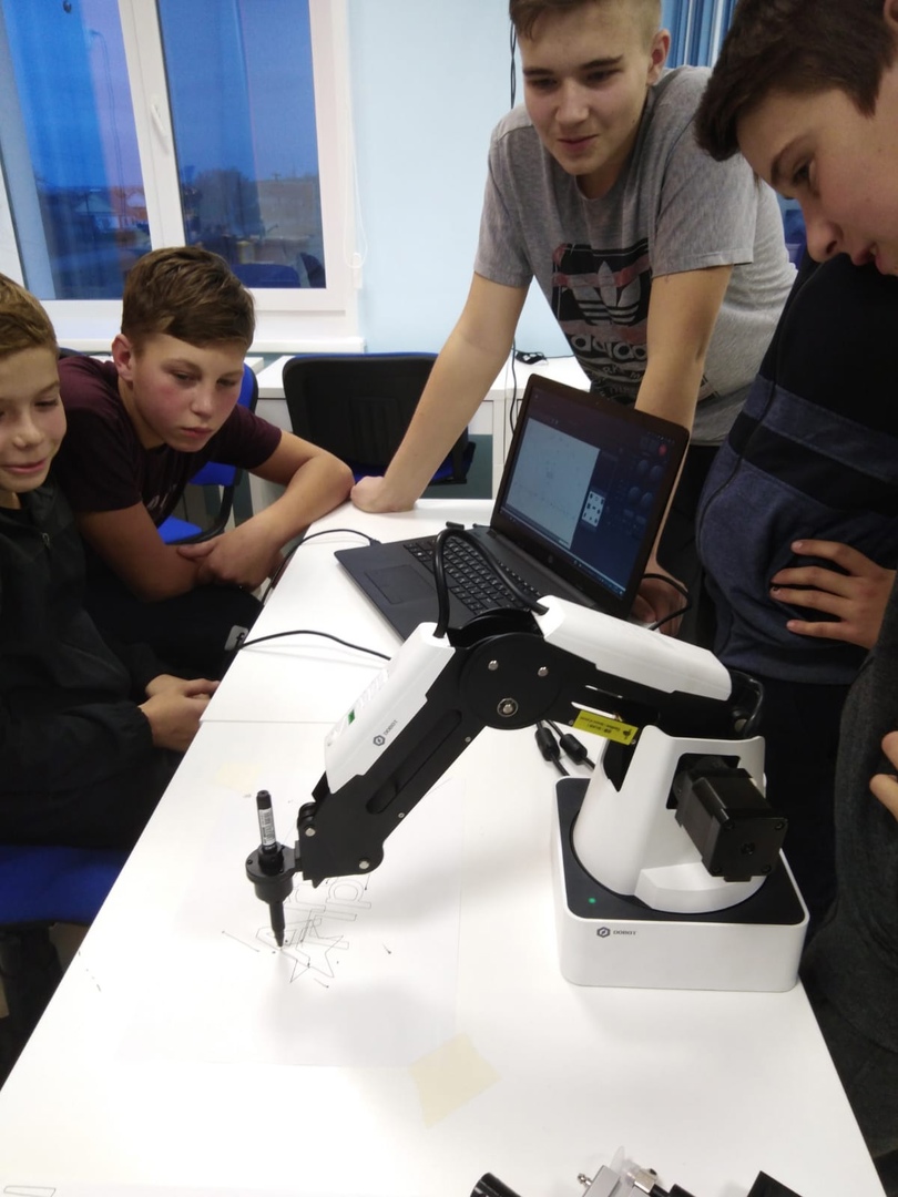 Под руководством Ишбаева А.А. юные робототехники уже освоили принципы работы робота-манипулятора, робота-карандаша, сейчас знакомятся с программой задач для письма и рисования.