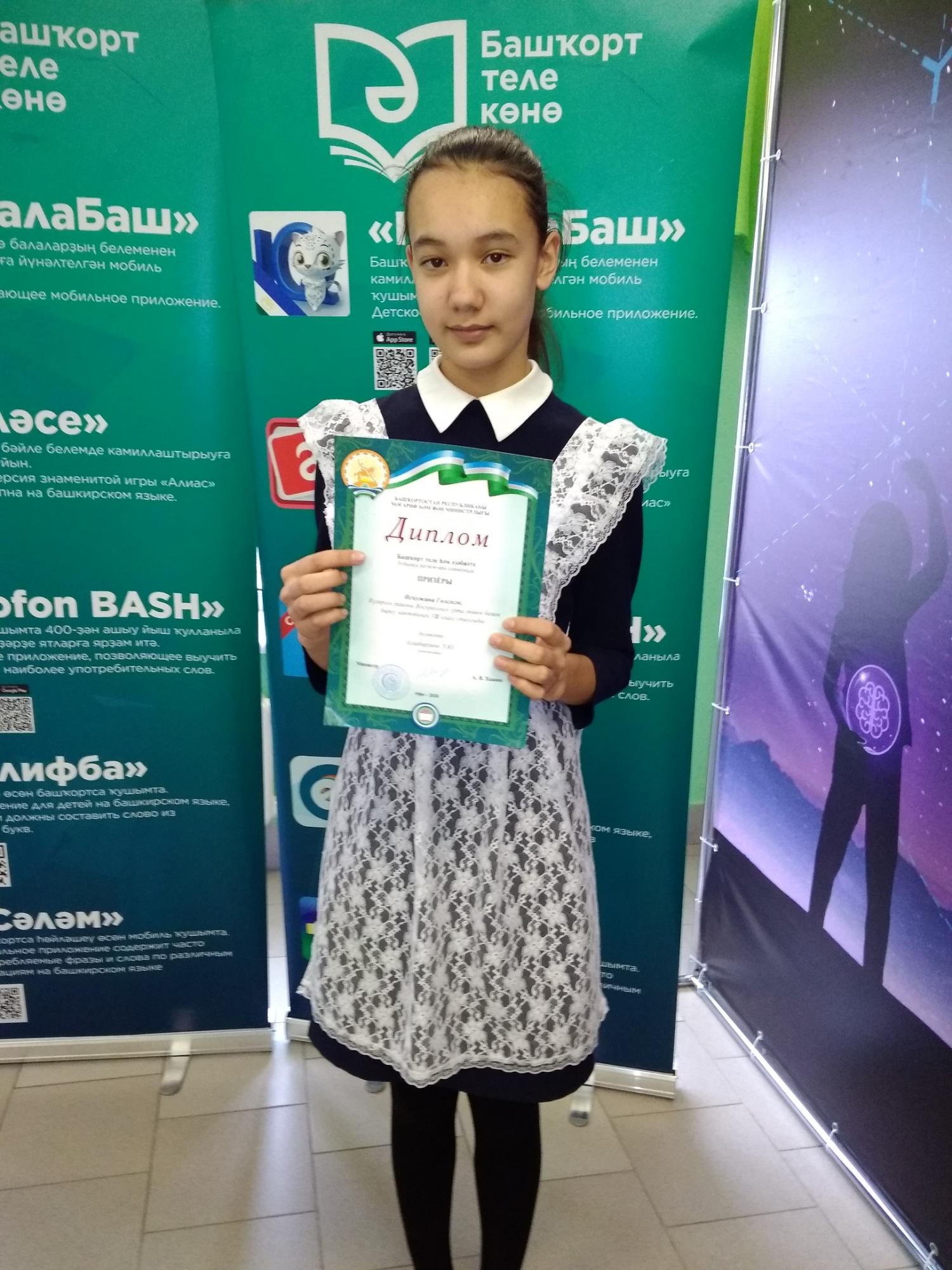 9-сы класта белем алыусылар Бакаева Анастасия һәм Исҡужина Гөлсәсәк. Олимпиада 3 турҙан торҙо. 1-се турҙа уҡыусылар викторина һорауҙарына яуап бирһә, 2 – се турҙа аудиотекст тыңлап, бирелгән эштәрҙе башҡарҙы, 3 – сө турҙа иһә ZOOM аша диалог һәм түңәрәк өҫтәлдә фекер алыштылар.