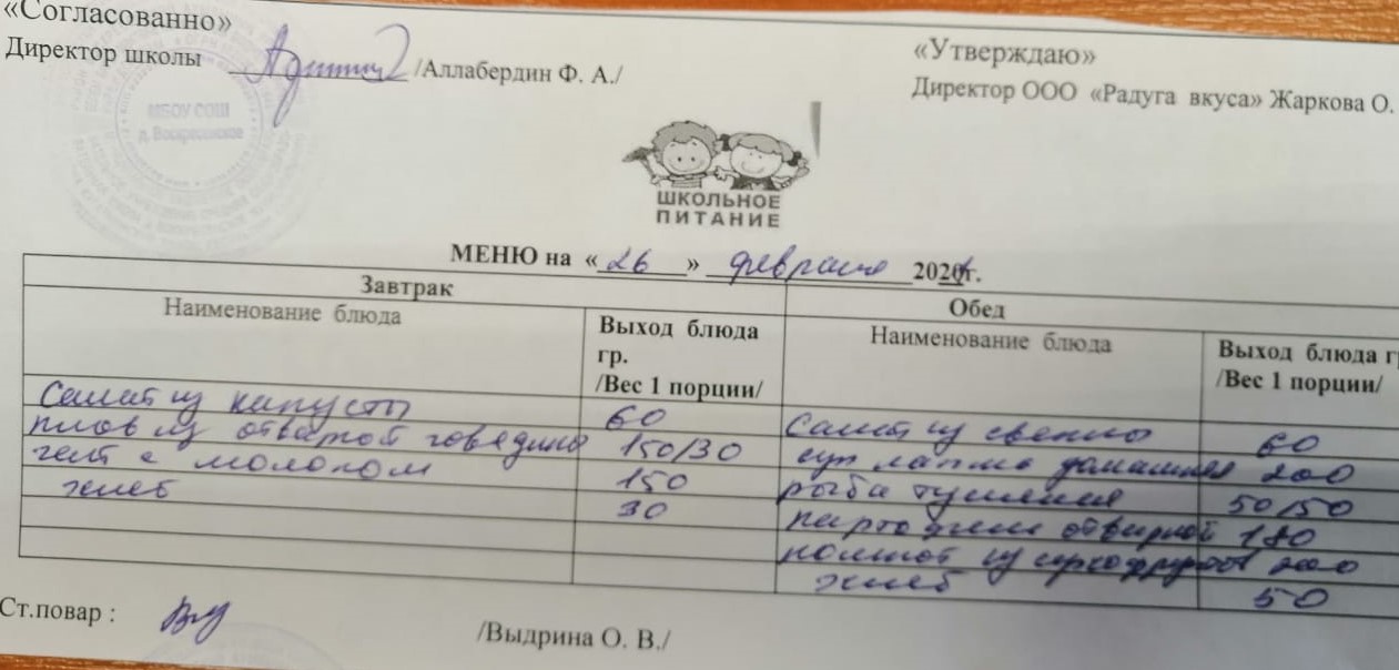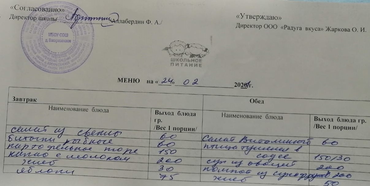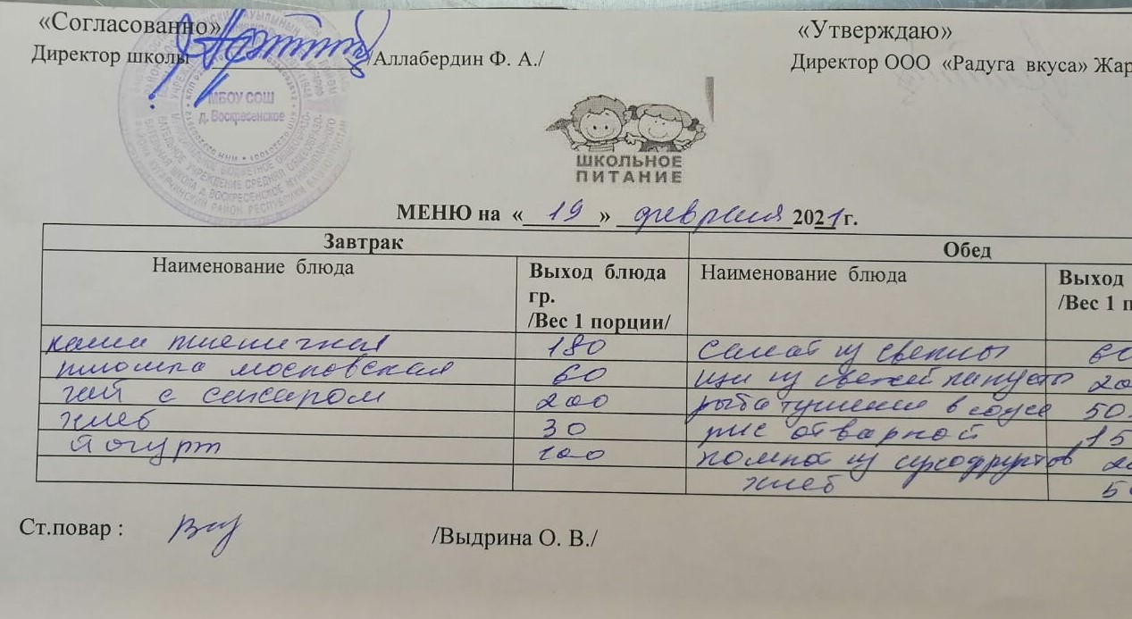 Питание осуществляется по следующим категориям: ОВЗ, дети-инвалиды, многодетные-малообеспеченные, 1-4 классы и 5-11 классы.Меню для учащихся 1-11 классов и детей из многодетных малообеспеченных семей состоит из завтрака, меню для детей с ОВЗ и детей -инвалидов состоит из завтрака и обеда.