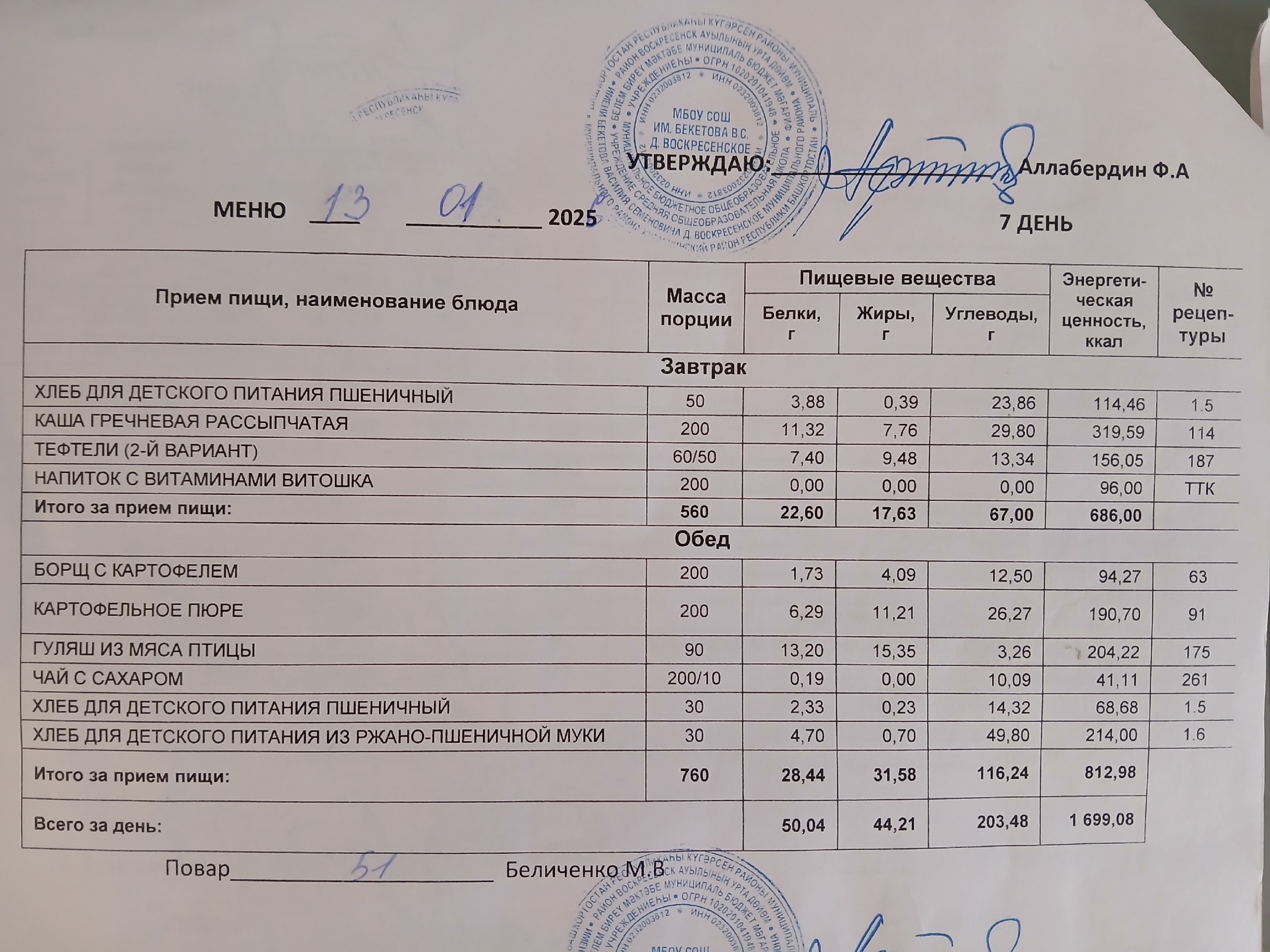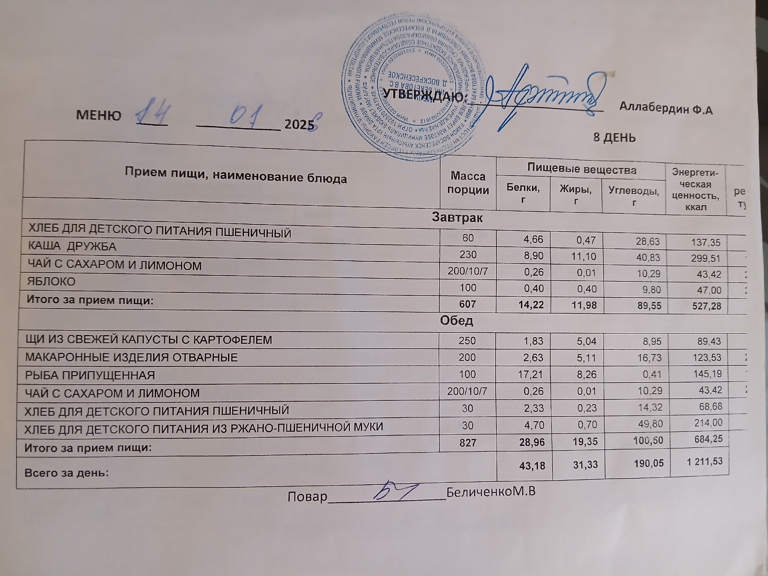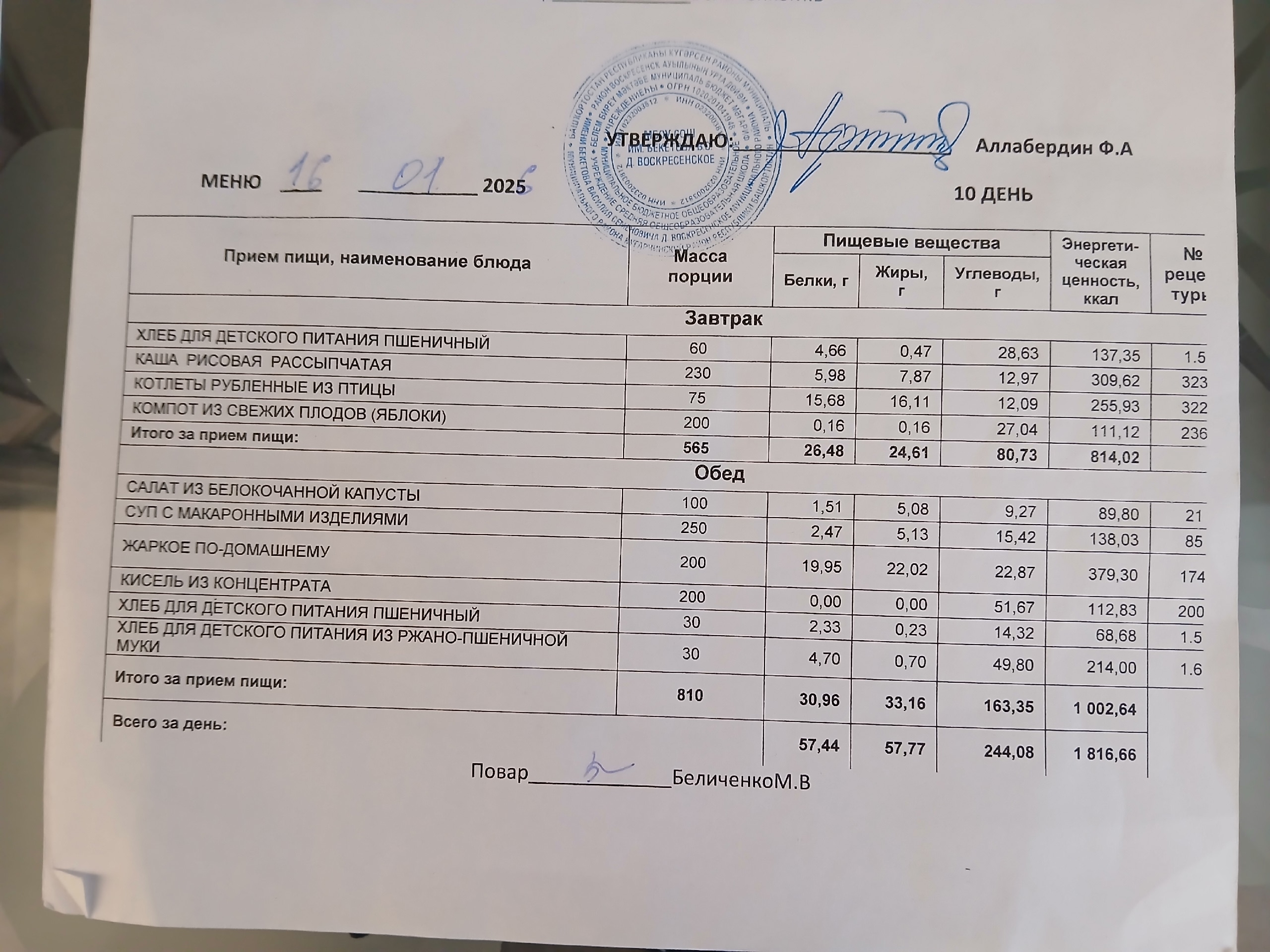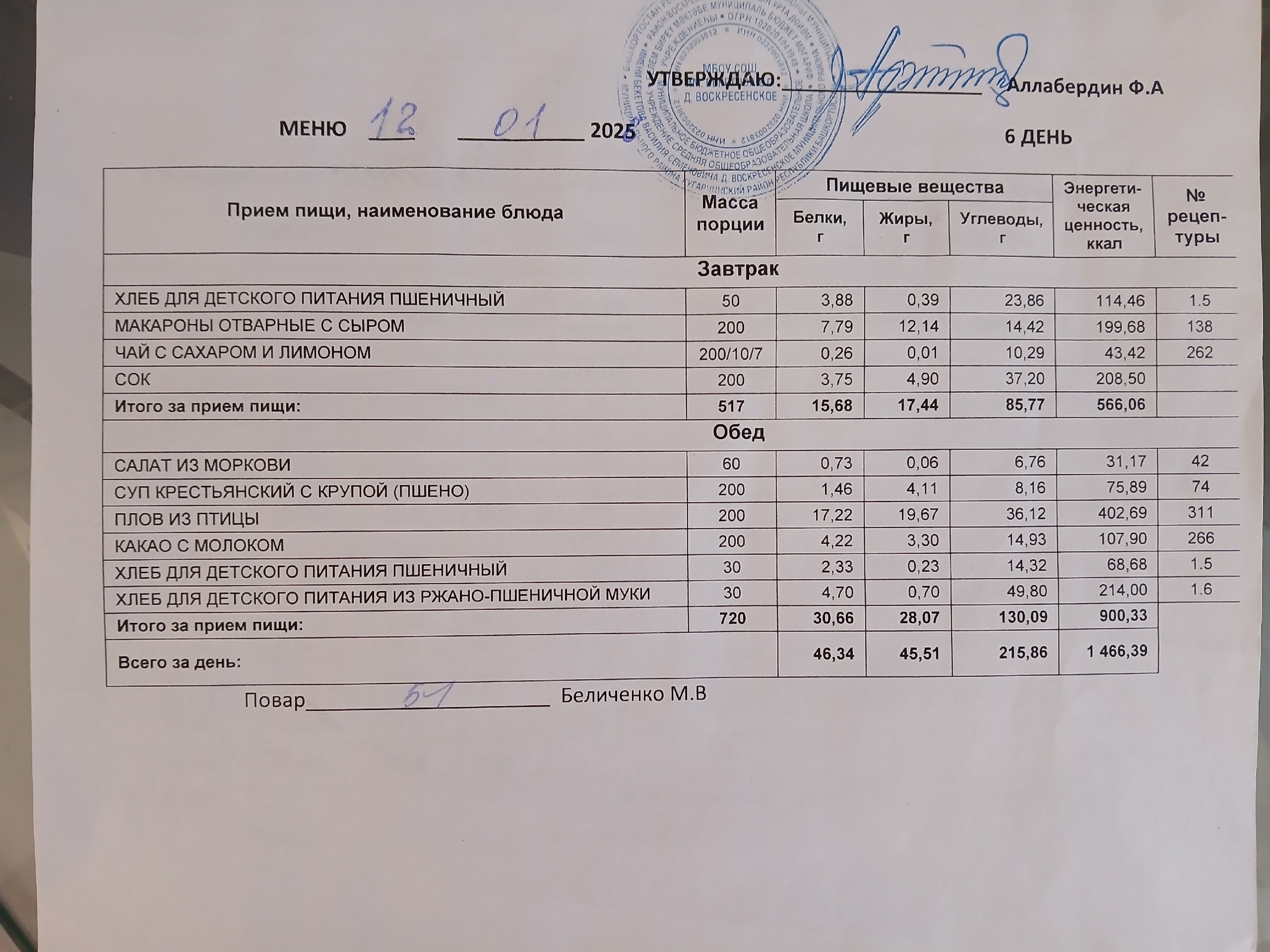 Сведения по организации питания в филиале МБОУ СОШ им.Бекетова В.С.д.Воскресенское ООШ с.Подгорное