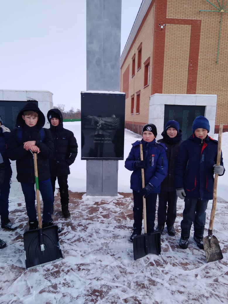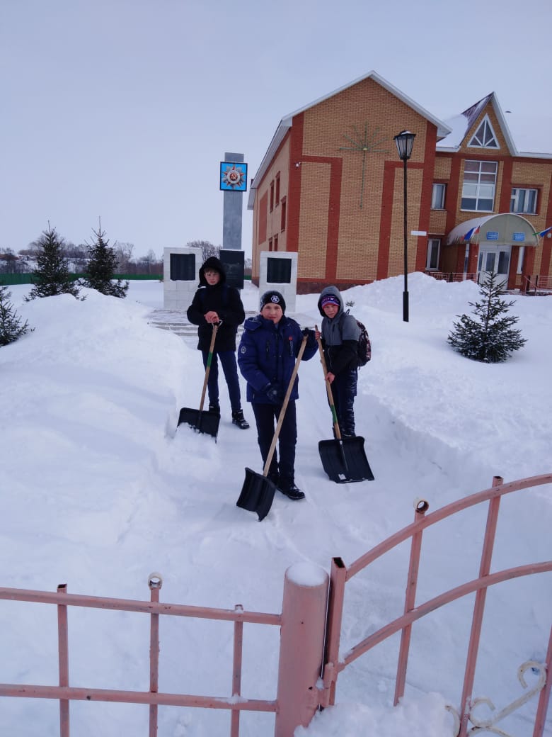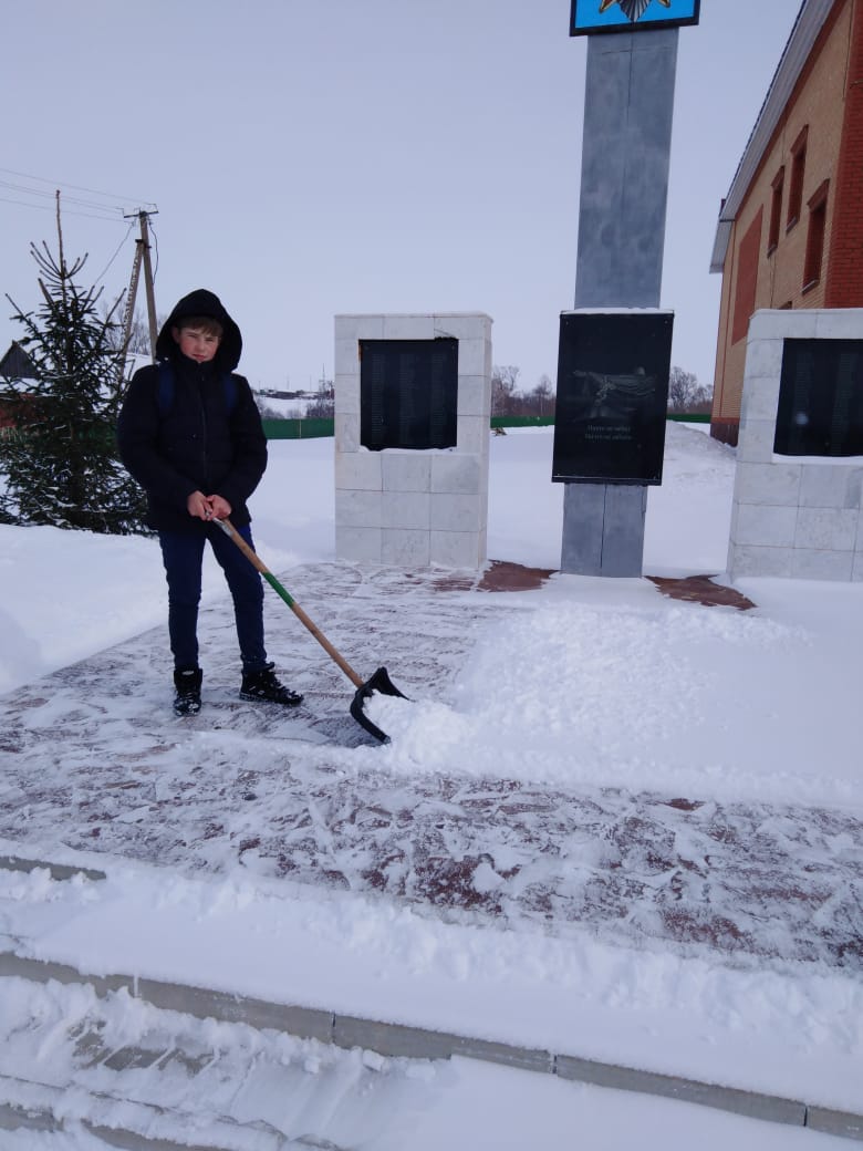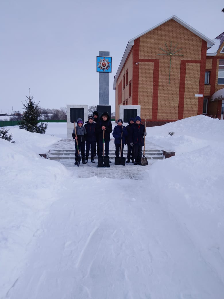В преддверии Дня Защитников Отечества мальчики 6 класса сделали доброе дело: очистили от снега территорию около памятника погибшим воинам в годы Великой Отечественной войны. Несмотря на мороз и порывистый ветер, школьники упорно сражались с белоснежными сугробами. Через несколько минут территория около памятника героям-землякам была расчищена.